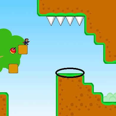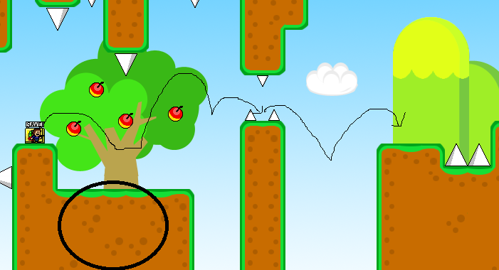 注意圈起来的地方地面会陷下去,然后箭头那里会有苹果飞下来砸你,躲开即可